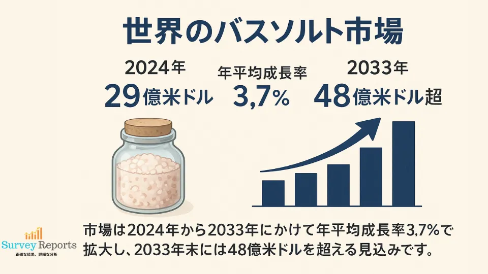 世界のバスソルト市場の2024年の市場規模は29億米ドル。市場は2024年から2033年にかけて年平均成長率3.7%で拡大し、2033年末には48億米ドルを超える見込みです。