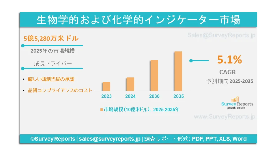 世界の生物・化学インジケーター市場は、2025年に5億5,280万米ドルと評価されました。市場は2025年から2035年にかけて年平均成長率5.1%で拡大し、2035年末には9億620万米ドルを超えると予測されています。