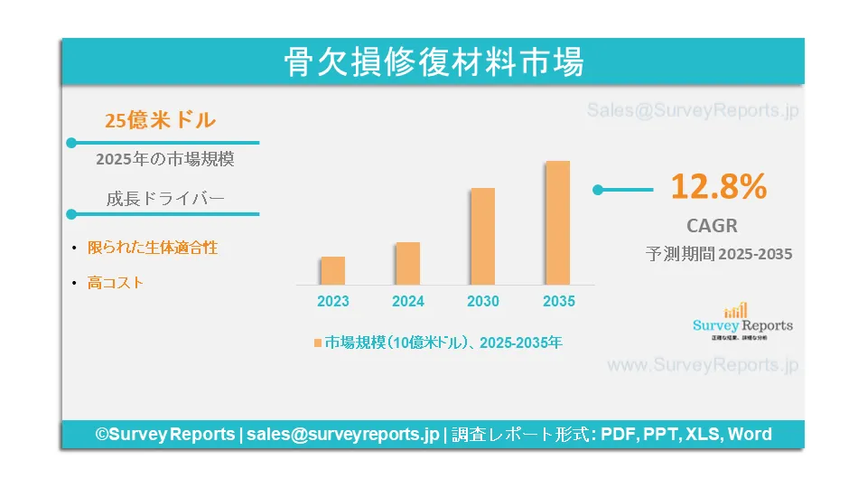 世界の骨欠損修復材料市場は2025年に25億米ドルと評価されました。同市場は2025年から2035年にかけて年平均成長率(CAGR)12.8%で拡大し、2035年末までに63億米ドルを超えると予測されています。