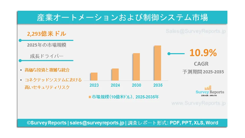 産業用オートメーションおよび制御システムの世界市場規模は、2025年に2,293億米ドル。2025年から2035年にかけて年平均成長率10.9%で拡大し、2035年末には5,779億米ドルを超えると予測されています。