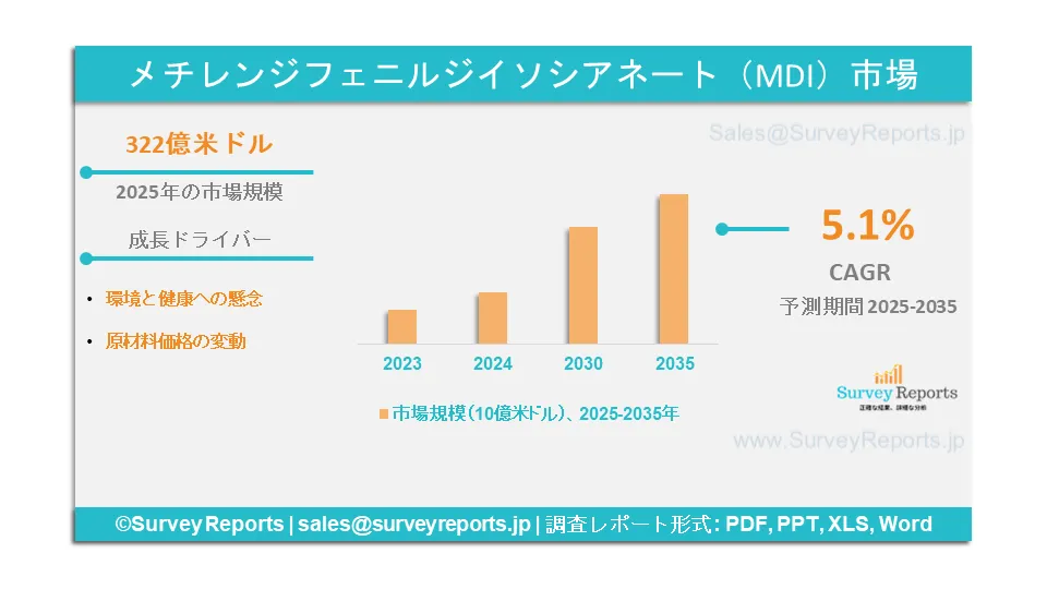 2025年の世界のメチレンジフェニルジイソシアネート(MDI)市場規模は322億米ドル。市場は2025年から2035年にかけて年平均成長率5.1%で拡大し、2035年末には524億米ドルを超える見込みです。