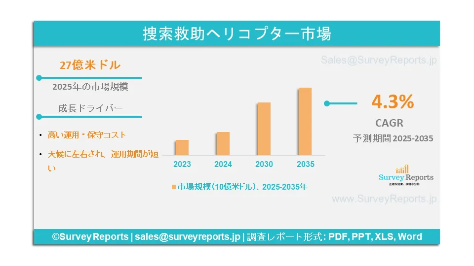 2025年の世界の捜索救助ヘリコプター市場規模は27億米ドル。市場は2025年から2035年にかけて年平均成長率4.3%で拡大し、2035年末には41億米ドルを超える見込み。